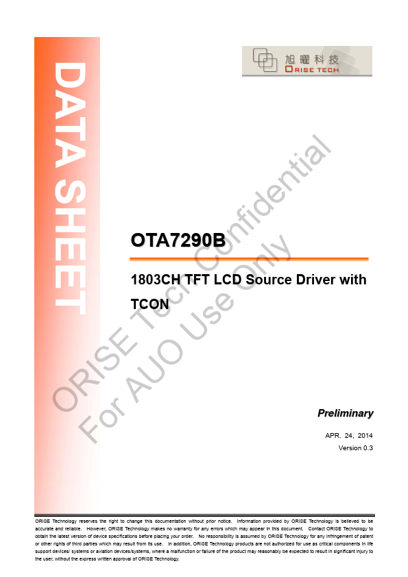 - Special design for middle size TFT LCD Panel with MIPI MIPI interface with timing controller for medium-size color TFT-LCD panels. The OTA7290B integrated source driver, timing l controller, VCOM buffer, Gamma buffer, GIP, image process unit tia and MIPI interface into single chip. The OTA7290B supports both MIPI with multi-drop and direct mode. Source output supports 8-bit resolution with 256 grayscale.