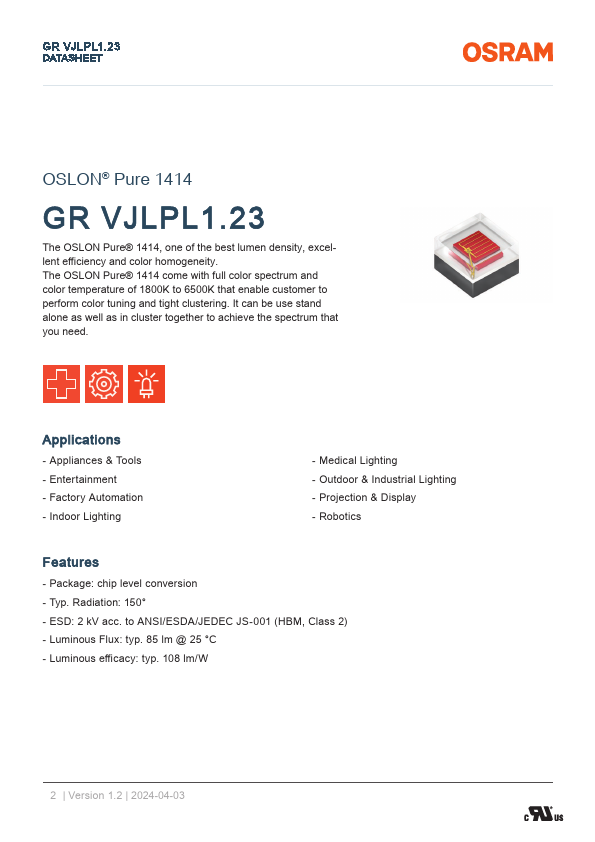 The OSLON Pure® 1414, one of the best lumen density, excellent efficiency and color homogeneity. The OSLON Pure® 1414 come with full color spectrum and color temperature of 1800K to 6500K that enable customer to perform color tuning and tight clustering. It can be use stand alone as well as in cluster together to achieve the spectrum that you need.