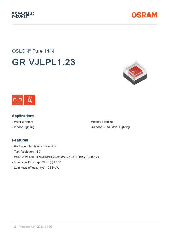 23 DATASHEET OSLON® Pure 1414 GR VJLPL1.23 Applications - Entertainment - Indoor Lighting - Medical Lighting - Outdoor & Industrial Lighting.