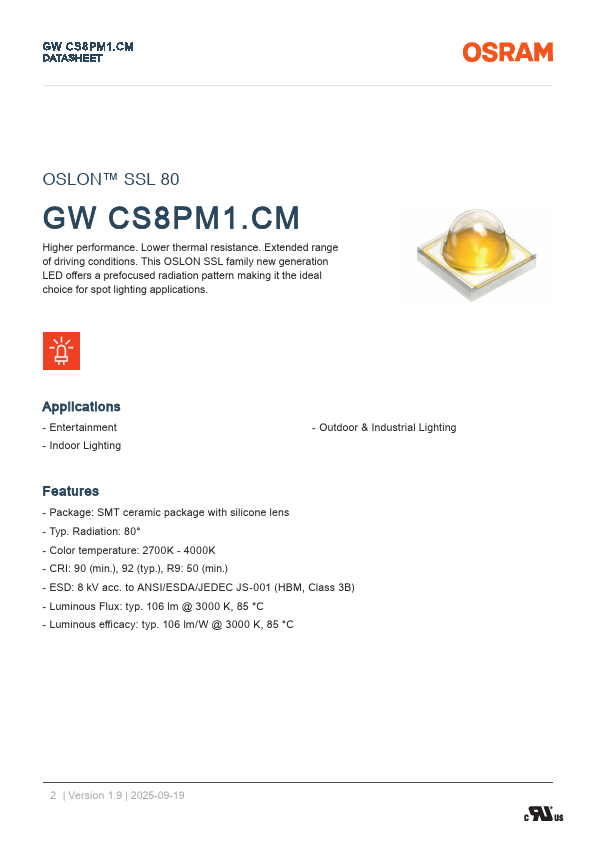 GW CS8PM1.CM DATASHEET OSLON™ SSL 80 GW CS8PM1.CM Higher performance. Extended range of driving conditions. This OSLON SSL family new generation LED offers a prefocused radiation pattern making it the ideal choice for spot lighting applications.