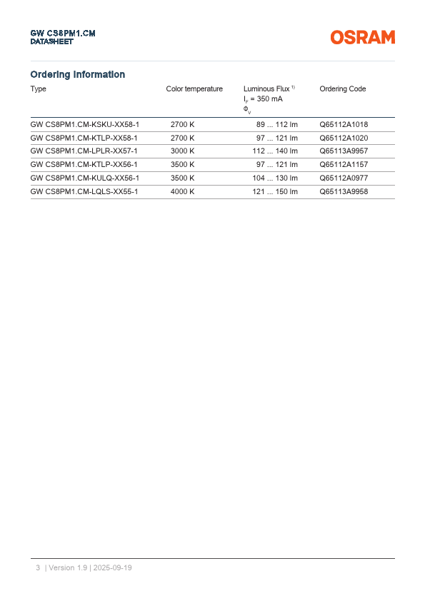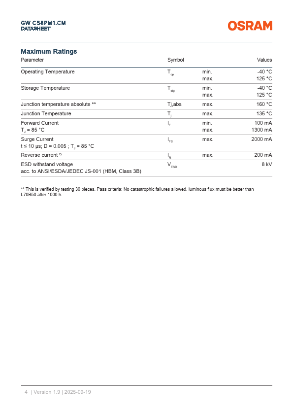- Luminous efficacy: typ. 106 lm/W @ 3000 K, 85 °C