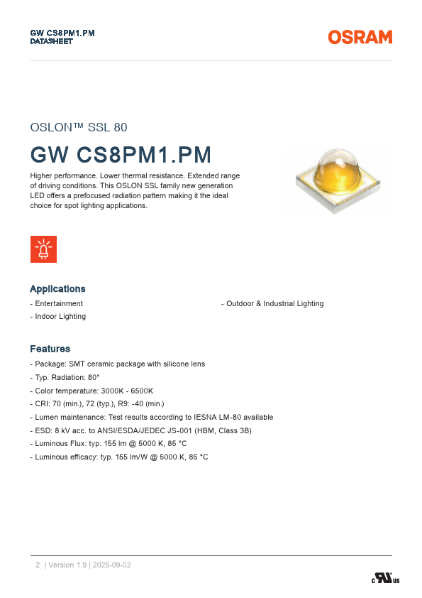 GW CS8PM1.PM DATASHEET OSLON™ SSL 80 GW CS8PM1.PM Higher performance. Extended range of driving conditions. This OSLON SSL family new generation LED offers a prefocused radiation pattern making it the ideal choice for spot lighting applications.