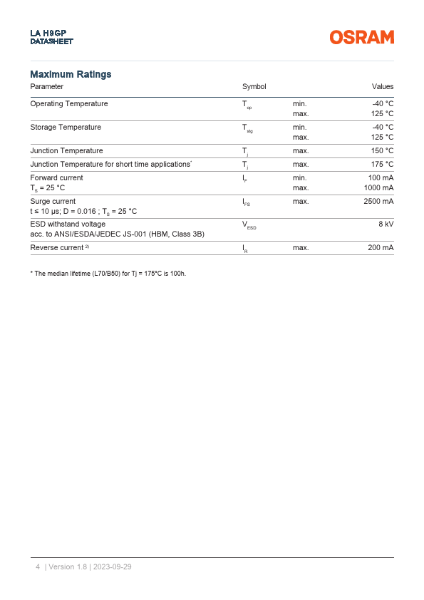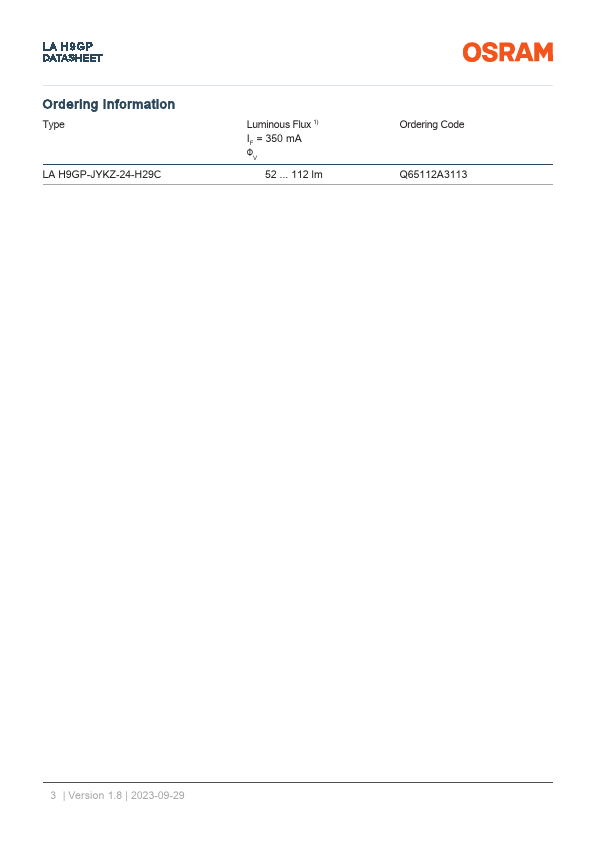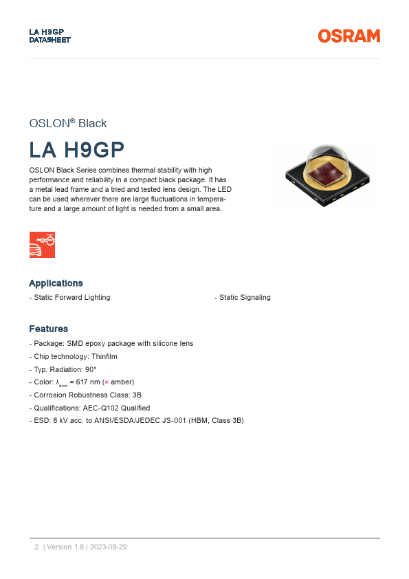 LA H9GP DATASHEET OSLON® Black LA H9GP OSLON Black Series bines thermal stability with high performance and reliability in a pact black package. It has a metal lead frame and a tried and tested lens design. The LED can be used wherever there are large fluctuations in temperature and a large amount of light is needed from a small area.