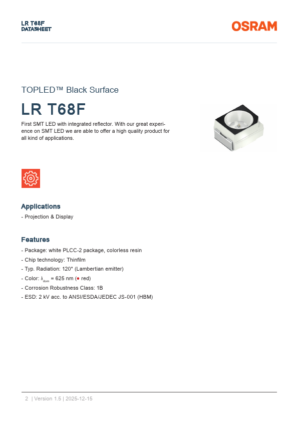 LR T68F DATASHEET TOPLED™ Black Surface LR T68F First SMT LED with integrated reflector. With our great experience on SMT LED we are able to offer a high quality product for all kind of applications. Applications - Projection & Display.