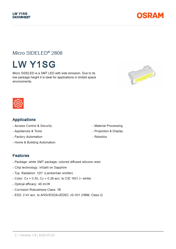 Micro SIDELED is a SMT LED with side emission. Due to its low package height it is ideal for applications in limited space environments.