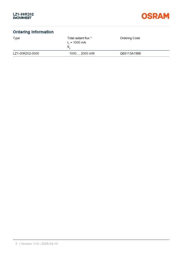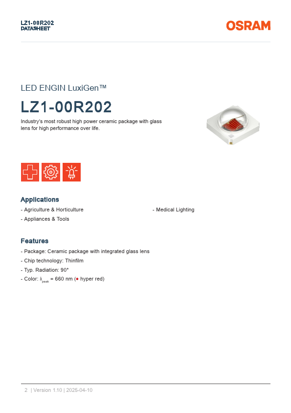 L Z1- 0 0 R 2 0 2 DATASHEET LED ENGIN LuxiGen™ LZ1-00R202 Industry’s most robust high power ceramic package with glass lens for high performance over life. Applications - Agriculture & Horticulture - Appliances & Tools - Medical Lighting.