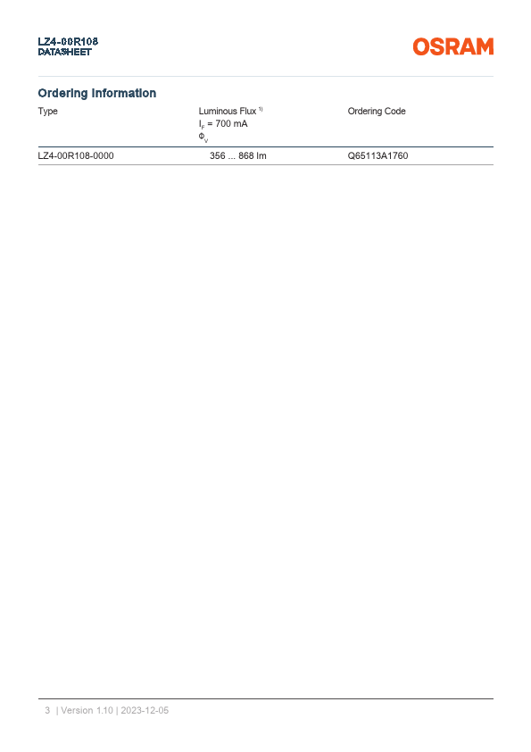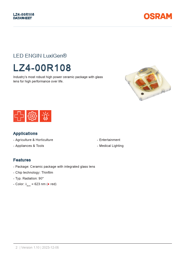 L Z4 - 0 0 R10 8 DATASHEET LED ENGIN LuxiGen® LZ4-00R108 Industry’s most robust high power ceramic package with glass lens for high performance over life. Applications - Agriculture & Horticulture - Appliances & Tools - Entertainment - Medical Lighting.