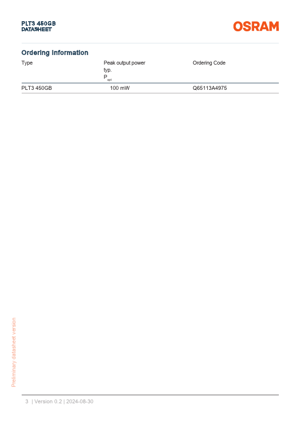 LD Anode Case LD Cathode 9 | Version 0.2 | 2024-08-30 Preliminary datasheet version PLT3 450GB DATASHEET Tray 7) 200 pieces per tray Barcode-Product-Label (BPL) 10 | Version 0.2 | 2024-08-30 Preliminary datasheet version Preliminary datasheet version Muster PLT3 450GB DATASHEET Schematic Transportation Box 7) Box Barcode label MuLlStiYTTO6P7L6EBDinB1i:nBP2i:-n1Q3-:2-M10L-220T2eam232p02S4CT0A2R6dC0dRRiCti0o7RnP7aTAlCTKEVXATR: (G) DEMY R18 GROUP: P-1+Q-1 210021998 OSSeRmAicM(o6PnO)d