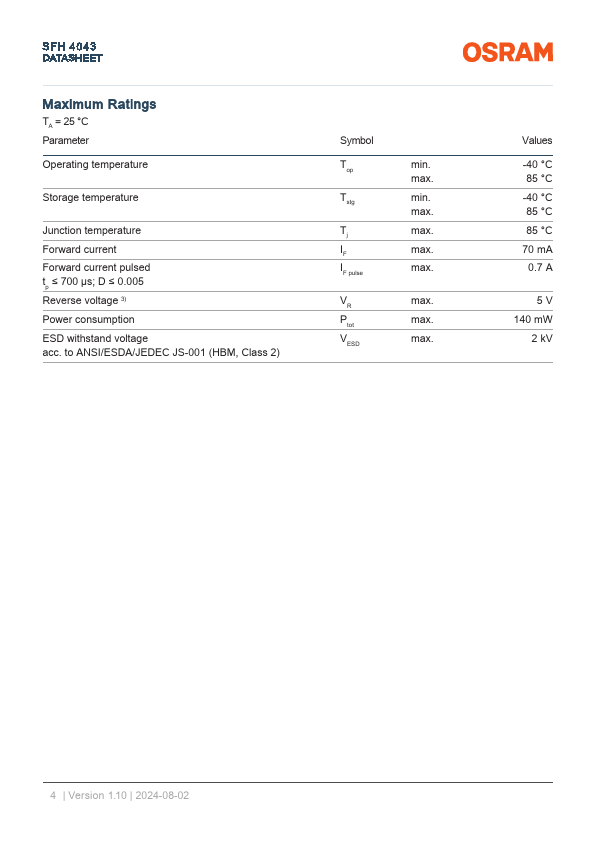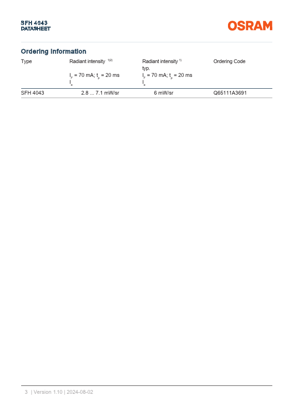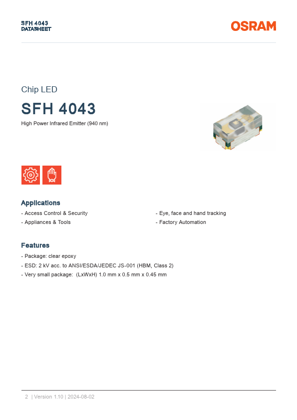 SFH 4043 DATASHEET Chip LED SFH 4043 High Power Infrared Emitter (940 nm) Applications - Access Control & Security - Appliances & Tools - Eye, face and hand tracking - Factory Automation.