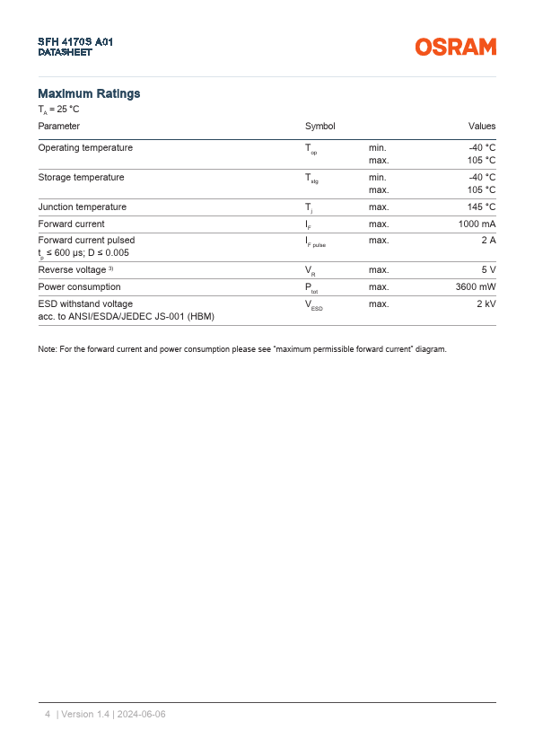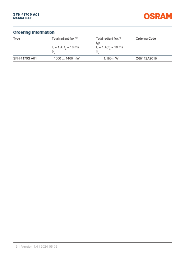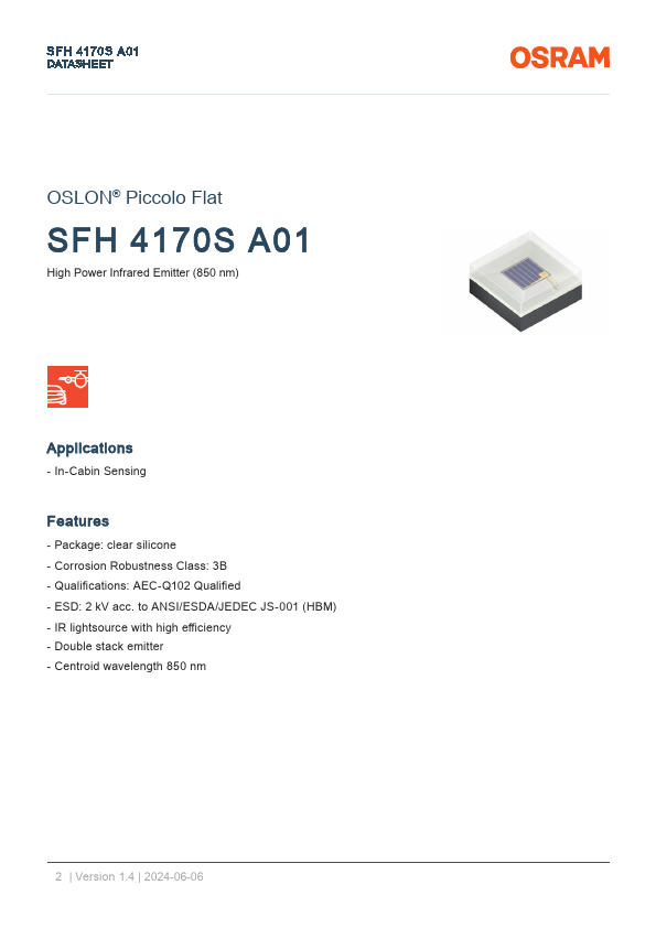 SFH 4170S A01 DATASHEET OSLON® Piccolo Flat SFH 4170S A01 High Power Infrared Emitter (850 nm) Applications - In-Cabin Sensing.