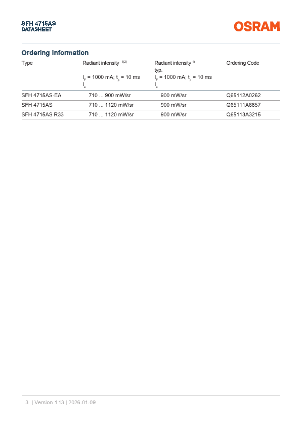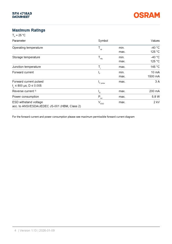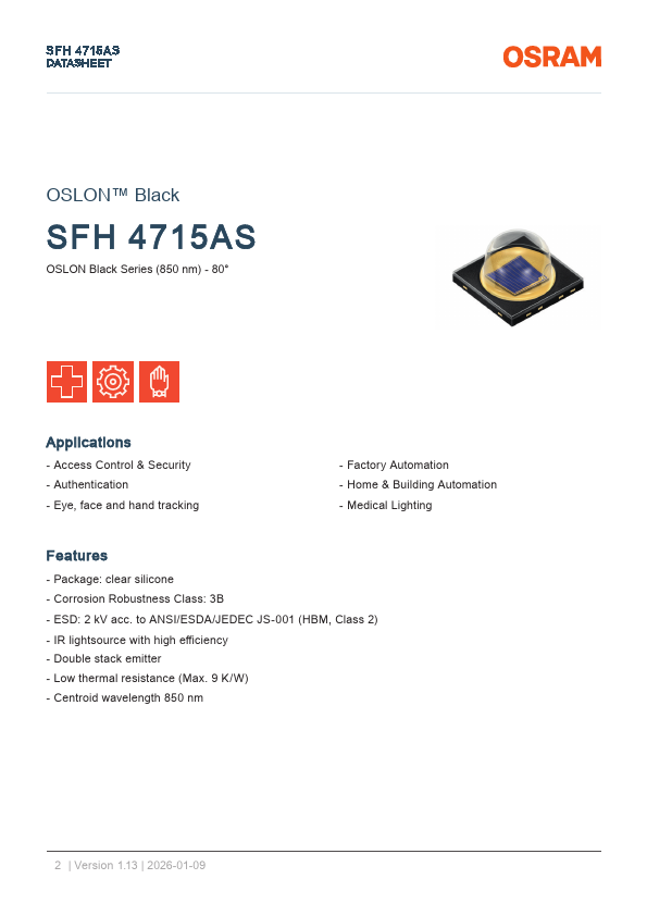 SFH 4715AS DATASHEET OSLON™ Black SFH 4715AS OSLON Black Series (850 nm) - 80° Applications - Access Control & Security - Authentication - Eye, face and hand tracking - Factory Automation - Home & Building Automation - Medical Lighting.