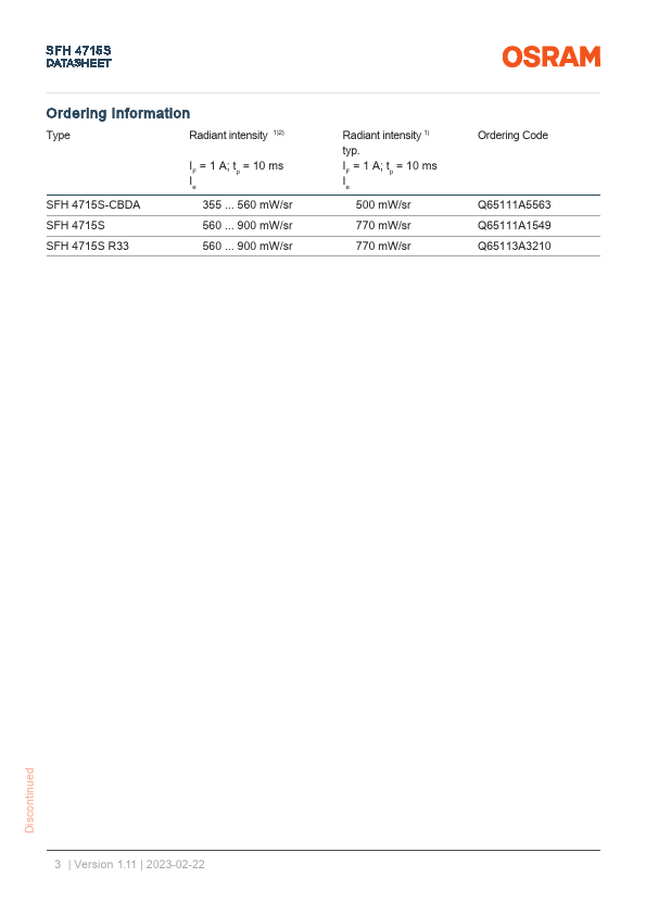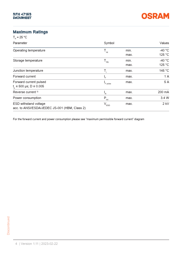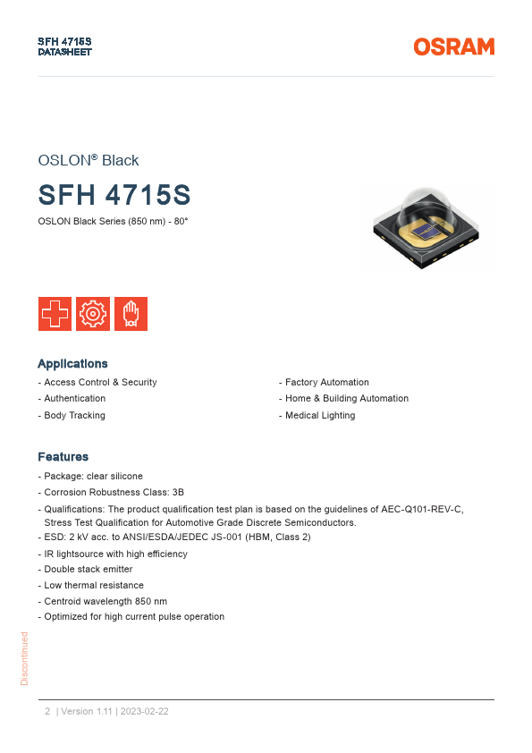 SFH 4715S DATASHEET OSLON® Black SFH 4715S OSLON Black Series (850 nm) - 80° Applications - Access Control & Security - Authentication - Body Tracking - Factory Automation - Home & Building Automation - Medical Lighting.