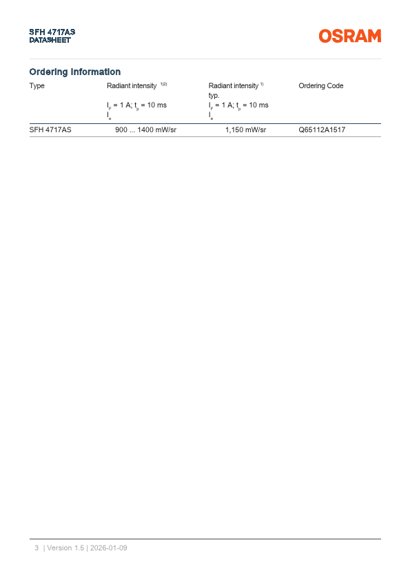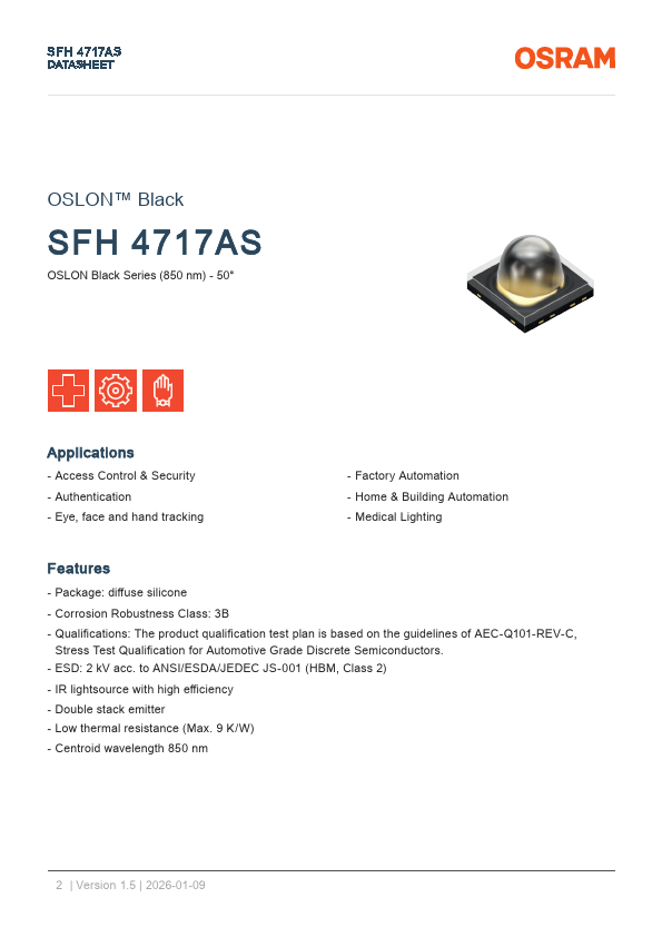 SFH 4717AS DATASHEET OSLON™ Black SFH 4717AS OSLON Black Series (850 nm) - 50° Applications - Access Control & Security - Authentication - Eye, face and hand tracking - Factory Automation - Home & Building Automation - Medical Lighting.