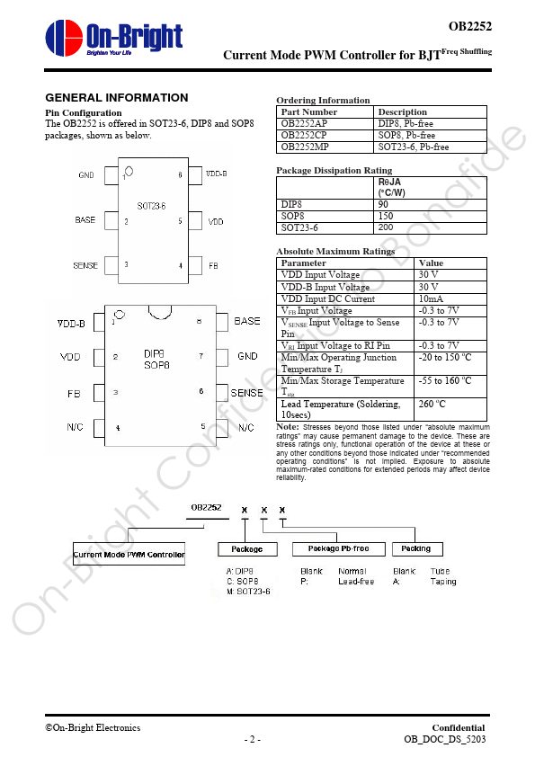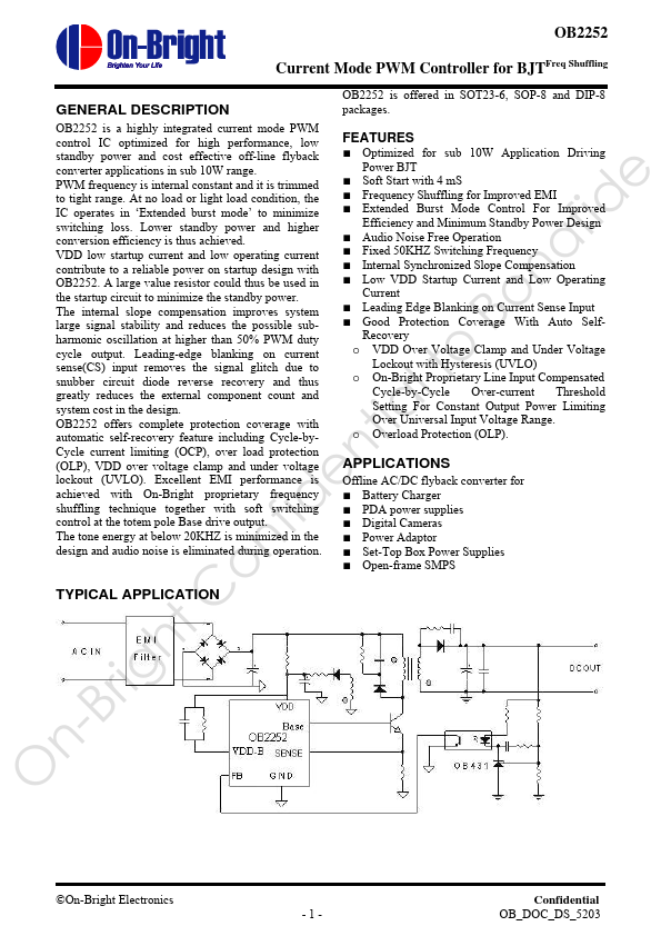 OB2252 is offered in SOT23-6, SOP-8 and DIP-8 packages. OB2252 is a highly integrated current mode PWM control IC optimized for high performance, low.