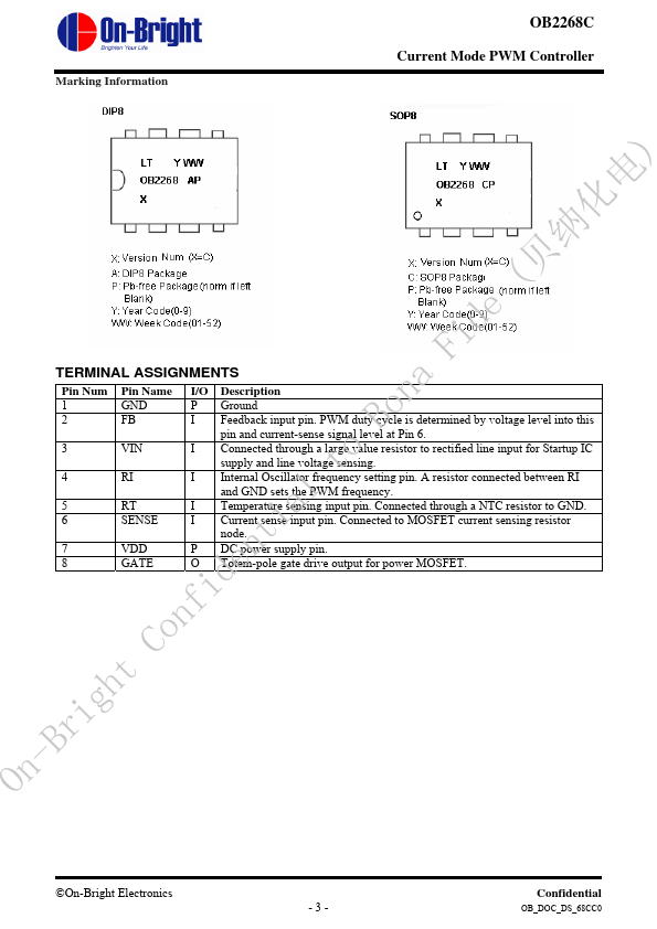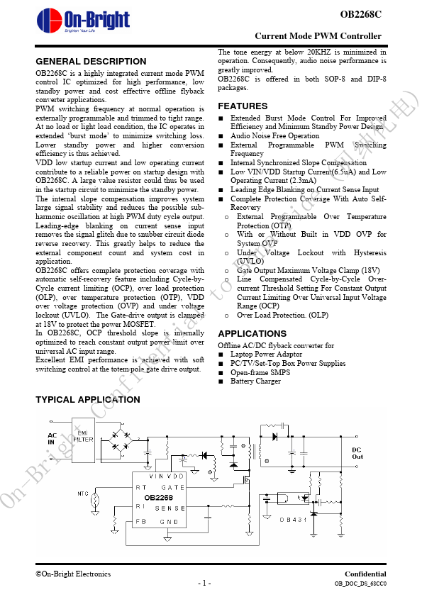 OB2268C is a highly integrated current mode PWM control IC optimized for high performance, low standby power and cost effective offline flyback converter applications. PWM switching frequency at normal operation is externally programmable and trimmed to tight range. At no load or light load condition, the IC operates in extended ‘burst mode’ to minimize switching loss.