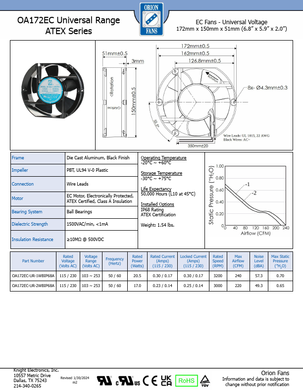 OA172EC Universal Range ATEX Series EC Fans - Universal Voltage 172mm x 150mm x 51mm (6.8” x 5.9” x 2.