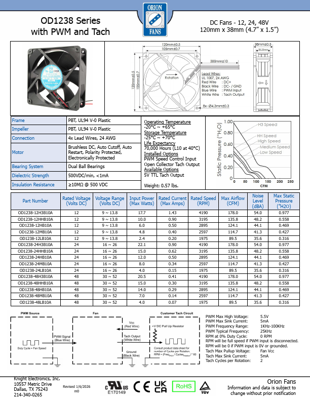 70K Hours (L10 at 40°C) Sleeve: 50K Hours (L10 at 40°C) Available Options Tachometer Output Alarm Output PWM Speed Control Input Temperature Speed Control IP Ratings Insulation Resistance ≥10MΩ @ 500 VDC Weight: Rated Voltage Voltage Range Input Power Rated Current Rated Speed Max Airflow (Volts DC) (Volts DC) (Max.