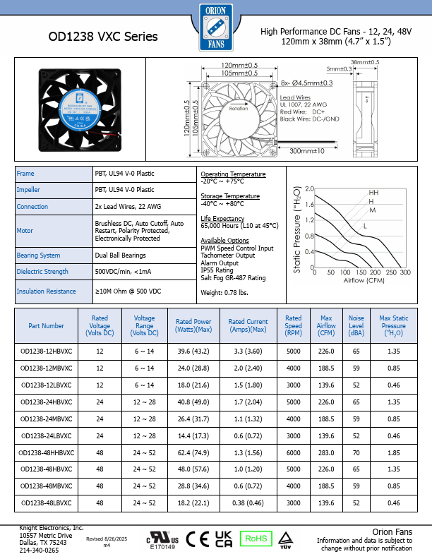 OD1238 VXC Series High Performance DC Fans - 12, 24, 48V 120mm x 38mm (4.7” x 1.5”) Frame Impeller Connection Motor Bearing System Dielectric Strength Insulation Resistance PBT, UL94 V-0 Plastic PBT, UL94 V-0 Plastic 2x Lead Wires, 22 AWG Brushless DC, Auto.