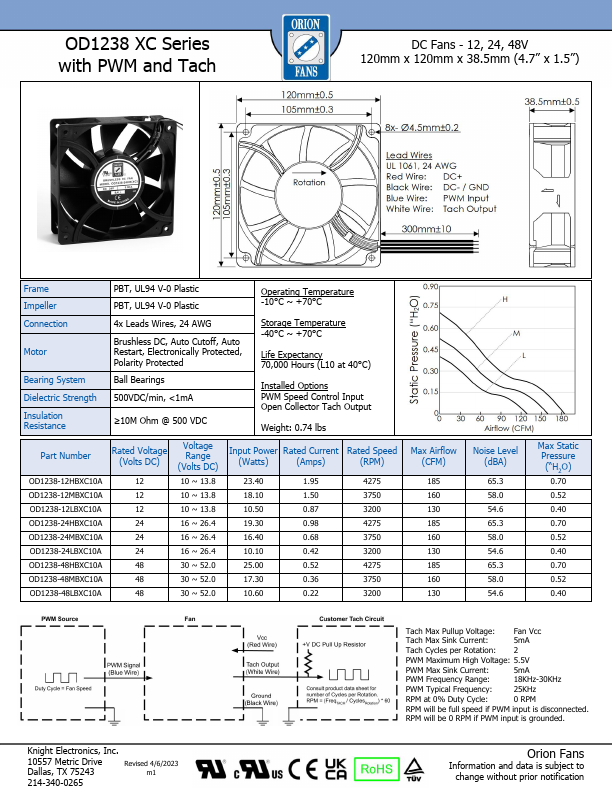 OD1238 XC Series DC Fans - 12, 24, 48V 120mm x 120mm x 38.5mm (4.7” x 1.5”) Frame Impeller Connection Motor Bearing System Dielectric Strength Insulation Resistance PBT, UL94 V-0 Plastic PBT, UL94 V-0 Plastic 2x Leads Wires, 24 AWG Brushless DC, Auto Cutoff,.