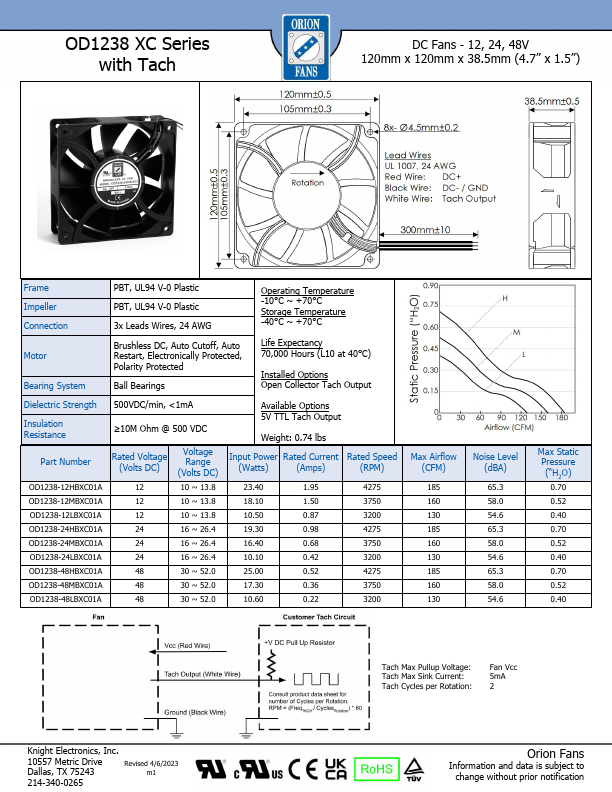 OD1238 XC Series DC Fans - 12, 24, 48V 120mm x 120mm x 38.5mm (4.7” x 1.5”) Frame Impeller Connection Motor Bearing System Dielectric Strength Insulation Resistance PBT, UL94 V-0 Plastic PBT, UL94 V-0 Plastic 2x Leads Wires, 24 AWG Brushless DC, Auto Cutoff,.
