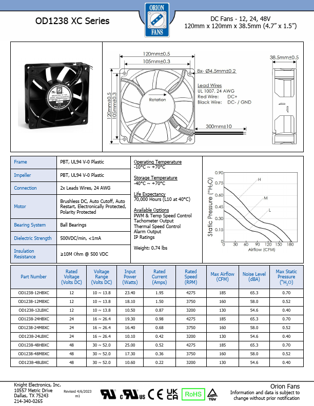 OD1238 XC Series DC Fans - 12, 24, 48V 120mm x 120mm x 38.5mm (4.7” x 1.5”) Frame Impeller Connection Motor Bearing System Dielectric Strength Insulation Resistance PBT, UL94 V-0 Plastic PBT, UL94 V-0 Plastic 2x Leads Wires, 24 AWG Brushless DC, Auto Cutoff,.