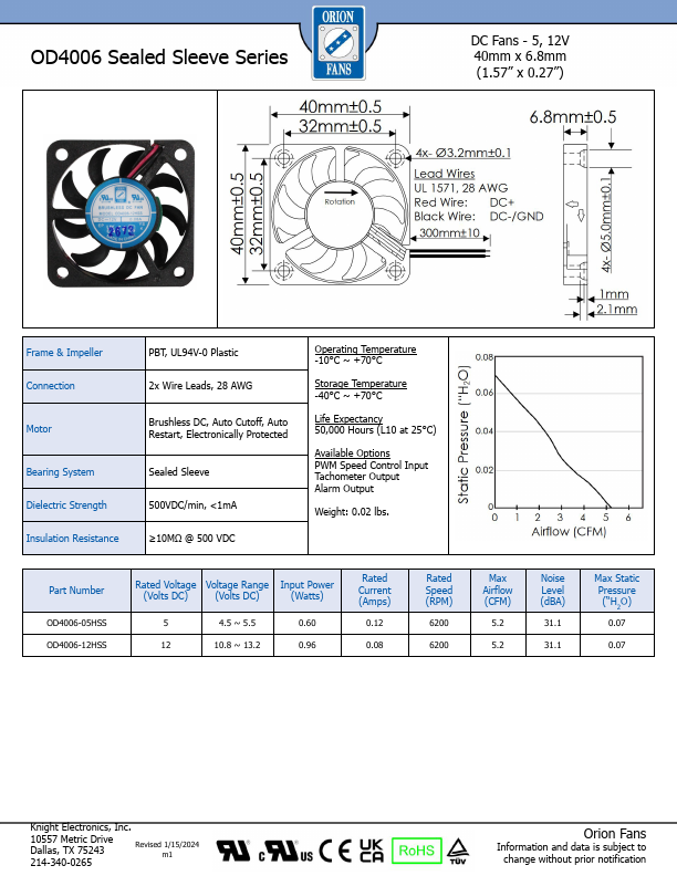 OD4006 Sealed Sleeve Series DC Fans - 5, 12V 40mm x 6.8mm (1.57” x 0.