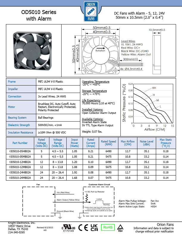 OD5010 Series DC Fans - 5, 12, 24V 50mm x 10.5mm (2.0” x 0.4”) Frame Impeller Connection Motor Bearing System Dielectric Strength Insulation Resistance PBT, UL94 V-0 Plastic PBT, UL94 V-0 Plastic 2x.