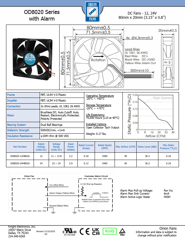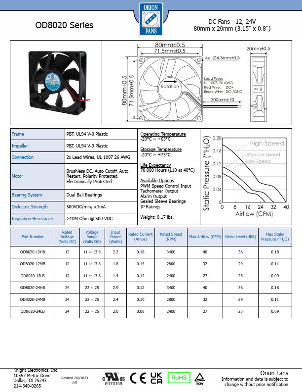 OD8020 Series DC Fans - 12, 24V 80mm x 20mm (3.15” x 0.8”) Frame Impeller Connection Motor Bearing System Dielectric Strength Insulation Resistance PBT, UL94 V-0 Plastic PBT, UL94 V-0 Plastic 2x.