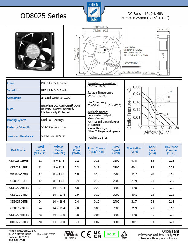 OD8025 Series DC Fans - 12, 24, 48V 80mm x 25mm (3.15” x 1.0”) Frame Impeller Connection Motor Bearing System Dielectric Strength Insulation Resistance PBT, UL94 V-0 Plastic PBT, UL94 V-0 Plastic 2x Lead Wires, 24 AWG Brushless DC, Auto Cutoff, Auto Restart,.