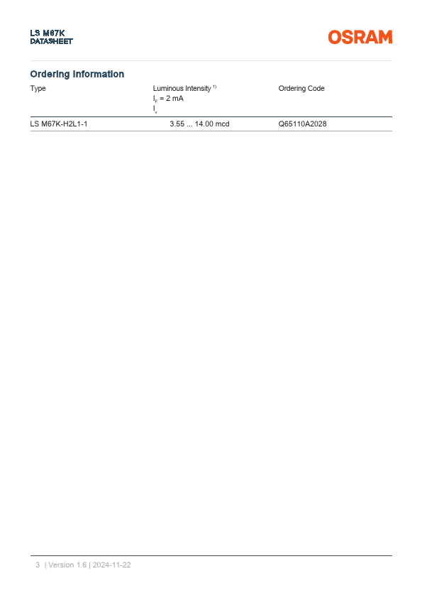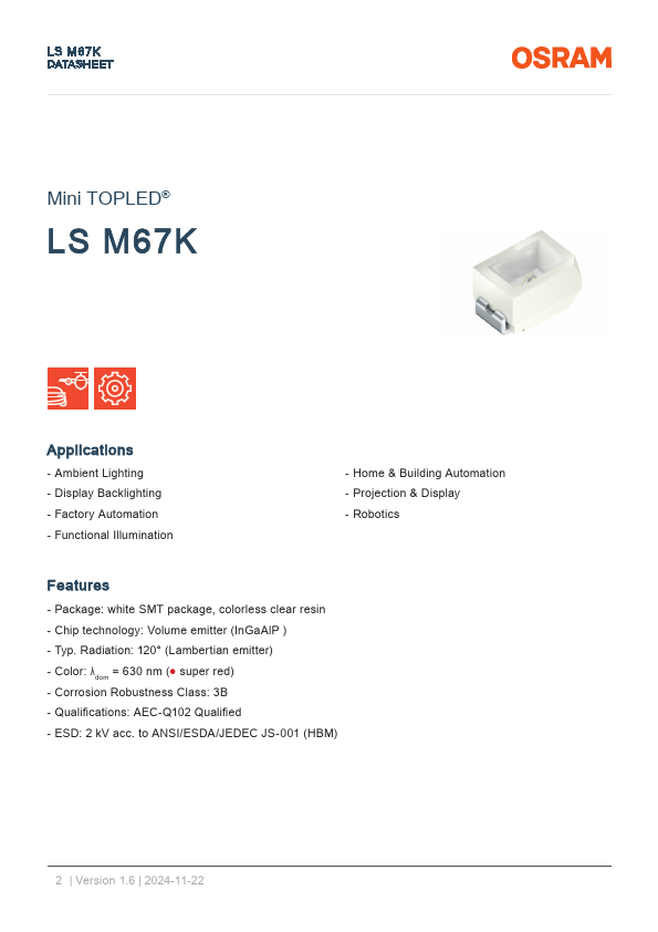 LS M67K DATASHEET Mini TOPLED® LS M67K Applications - Ambient Lighting - Display Backlighting - Factory Automation - Functional Illumination - Home & Building Automation - Projection & Display - Robotics.