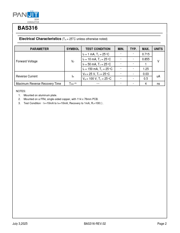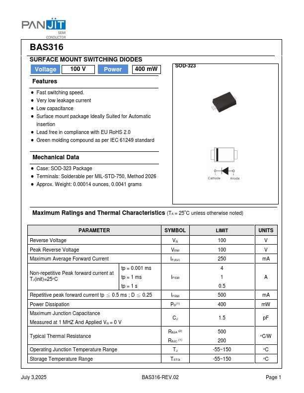 BAS316 SURFACE MOUNT SWITCHING DIODES Voltage 100 V Power 400.