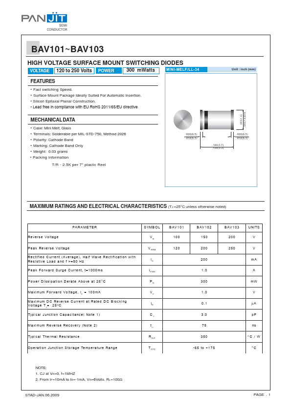 BAV101~BAV103 HIGH VOLTAGE SURFACE MOUNT SWITCHING DIODES VOLTAGE 120 to 250 Volts POWER 300 mWatts MINI-MELF/LL-34.