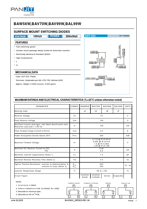 BAW56W,BAV70W,BAV99W,BAL99W SURFACE MOUNT SWITCHING DIODES VOLTAGE 100Volt POWER 200mWatt.