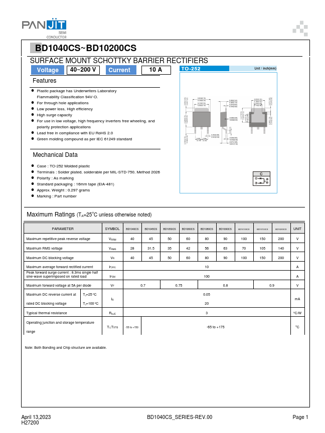 Overview: BD1040CS~BD10200CS SURFACE MOUNT SCHOTTKY BARRIER RECTIFIERS Voltage 40~200 V Current 10.