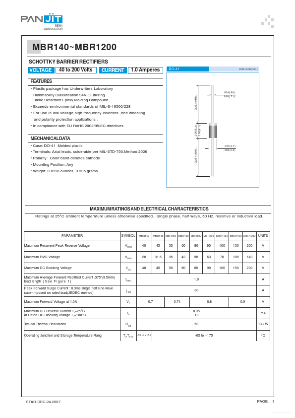Overview: MBR140~MBR1200 SCHOTTKY BARRIER RECTIFIERS VOLTAGE 40 to 200 Volts CURRENT 1.