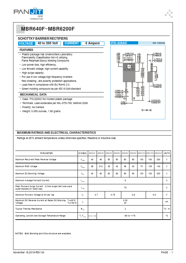 MBR645 | SCHOTTKY BARRIER RECTIFIERS | Pan Jit International |