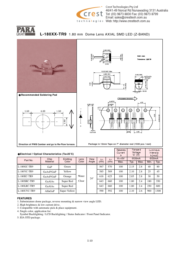 Crest Technologies Pty Ltd 46/41-49 Norcal Rd Nunawading 3131 Australia Tel: http://.cresttech..au L-180XX-TR9 1.80 mm Dome Lens AXIAL SMD LED (Z-BAND) Remended Soldering Pad DDiirreeccttiioonn ooff PPWWBB CCaammbbeerr aanndd ggoo ttoo RRee--FFllooww ffuurrnnaaccee. Package in 12mm Tape on 7" diameter reel (1500 pcs / reel) Electrical / Optical Characteristics (Ta=25ºC) Part No.