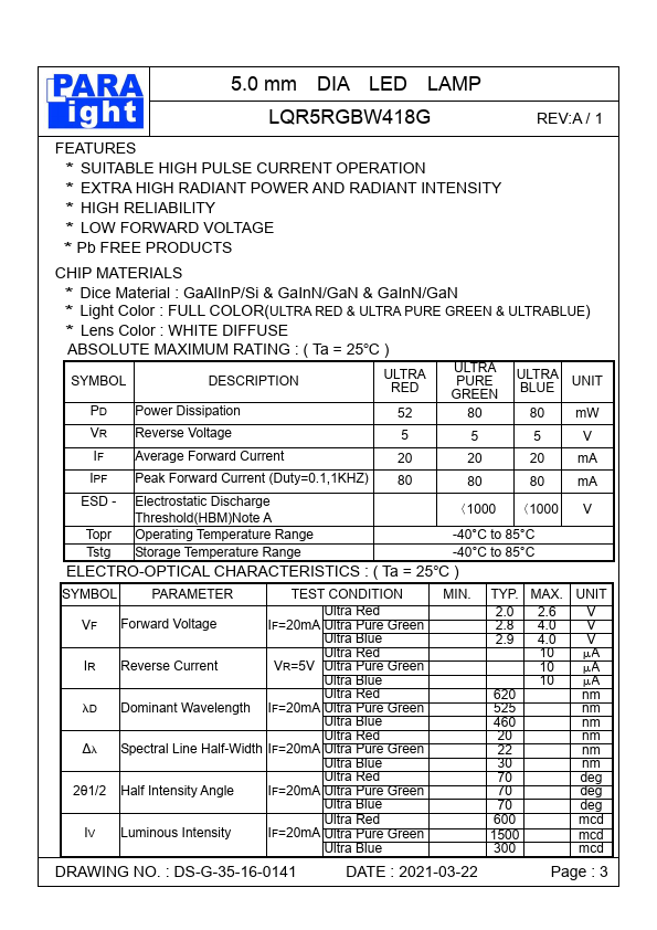 ULTRA RED PD Power Dissipation 52 ULTRA PURE GREEN 80 ULTRA BLUE UNIT 80 mW VR Reverse Voltage 5 5 5 V IF Average Forward Current 20 20 20 mA IPF Peak Forward Current (Duty=0.1,1KHZ) 80 80 80 mA ESD - Electrostatic Discharge Threshold(HBM)Note A 〈1000 〈1000 V Topr Operating Temperature Range -40°C to 85°C Tstg Storage Temperature Range -40°C to 85°C ELECTRO-OPTICAL CHARACTERISTICS : ( Ta = 25C ) SYMBOL PARAMETER TEST CONDITION VF IR D Δ 2θ1/2 Ultra Red