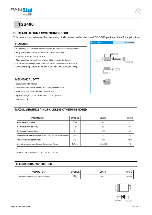 1SS400 SURFACE MOUNT SWITCHING DIODE This device is an extremely fast switching diode housed in the ultra-small SOD-523 package.