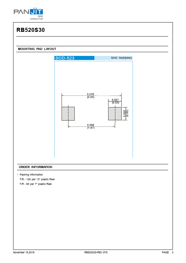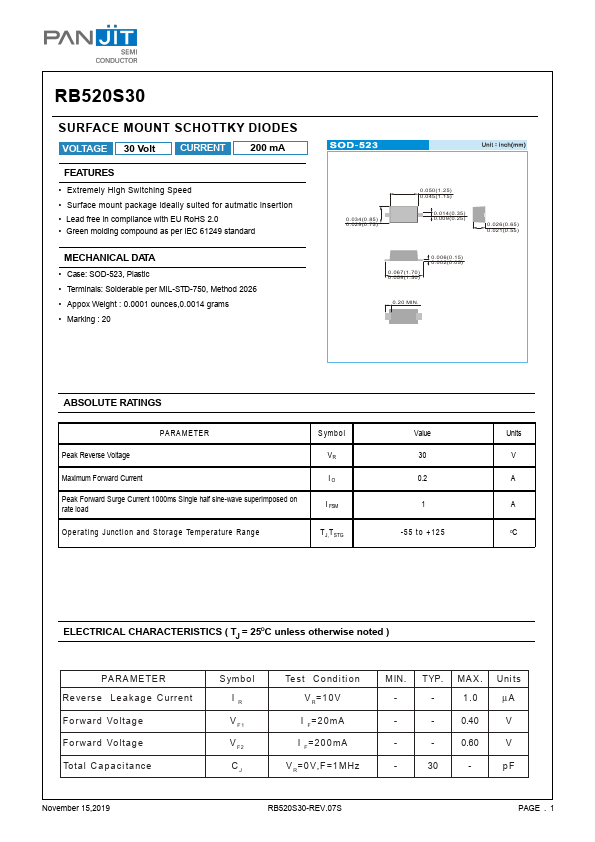 RB520S30 SURFACE MOUNT SCHOTTKY DIODES VOLTAGE 30 Volt CURRENT 200.