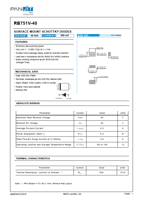 RB751V-40 SURFACE MOUNT SCHOTTKY DIODES VOLTAGE 40 Volt CURRENT 300.