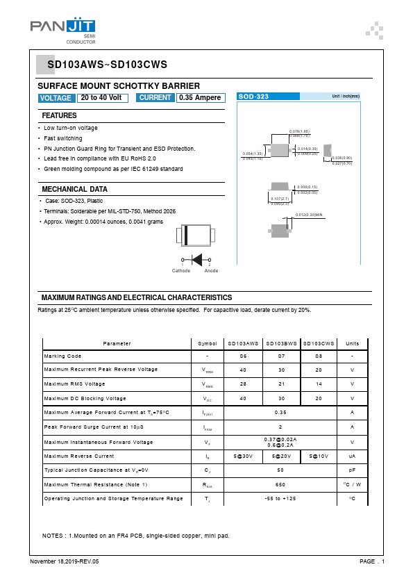 SD103AWS~SD103CWS SURFACE MOUNT SCHOTTKY BARRIER VOLTAGE 20 to 40 Volt CURRENT 0.35 Ampere.