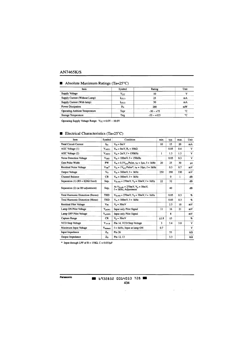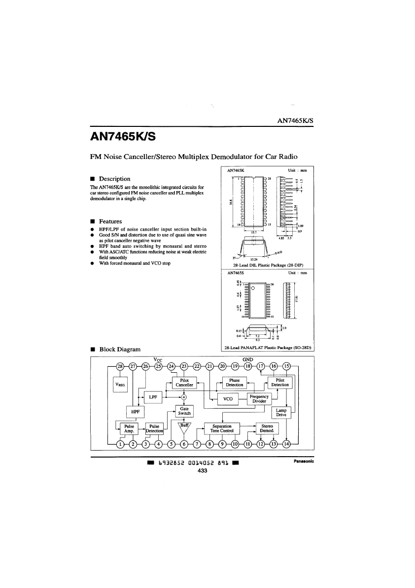 The AN7465K/S are the monolithic integrated circuits for car stereo configured FM noise canceller and PLL multiplex demodulator in a single chip.