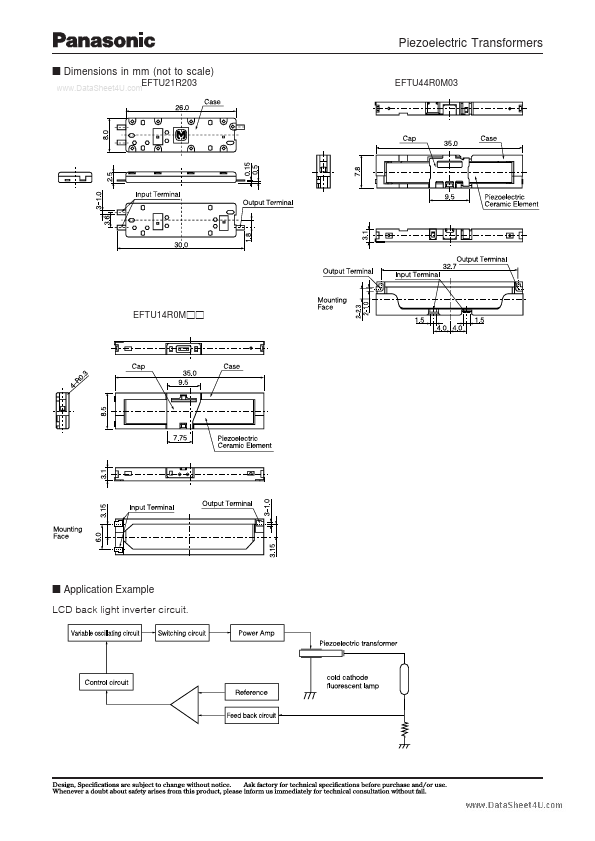 Piezoelectric Transformers www.DataSheet4U.com Piezoelectric Transformers Designed for LCD back light inverter for portable electronic equipment such as Notebook PCs. Any applications where space saving, light weight, low power consumption and safety are essential. n Features l Thin and high transfer efficiency of 93% l Lower EMI radiations due to the unique piezoelectric inverter system n Recommended Applications l Back light inverter for LCD l High voltage power supply n Safety Precautions (See Page 234) n Explanation of Part Numbers EFT E 2 1R 2M0 1 free n Rating and Characteristics (Typ.) Characteristics Type Vibration Mode Input Power (W) Transfer Efficiency (%) Transfer Ratio Resonant Frequency (kHz) ] Load resistance (at 95 k½) ] Please contact us for more information.