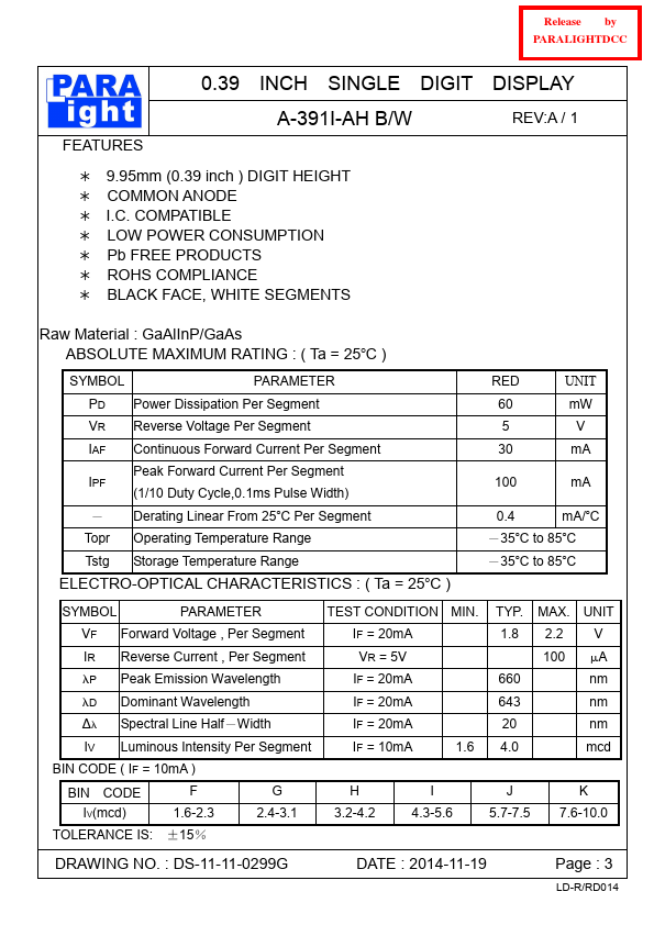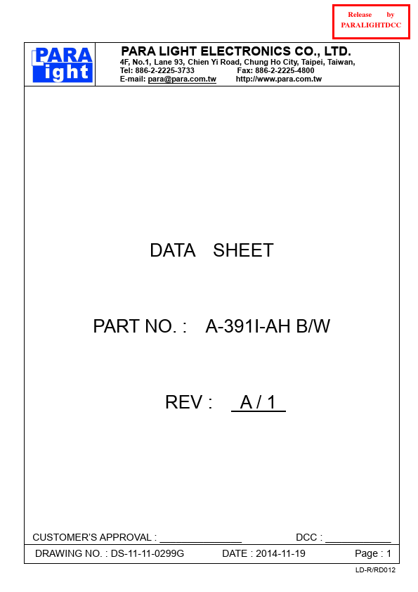 Release by PARALIGHTDCC PARA LIGHT ELECTRONICS CO., LTD. 4F, No.1, Lane 93, Chien Yi Road, Chung Ho City, Taipei, Taiwan, Tel: 886-2-2225-4800 http://.para..tw DATA SHEET PART NO.