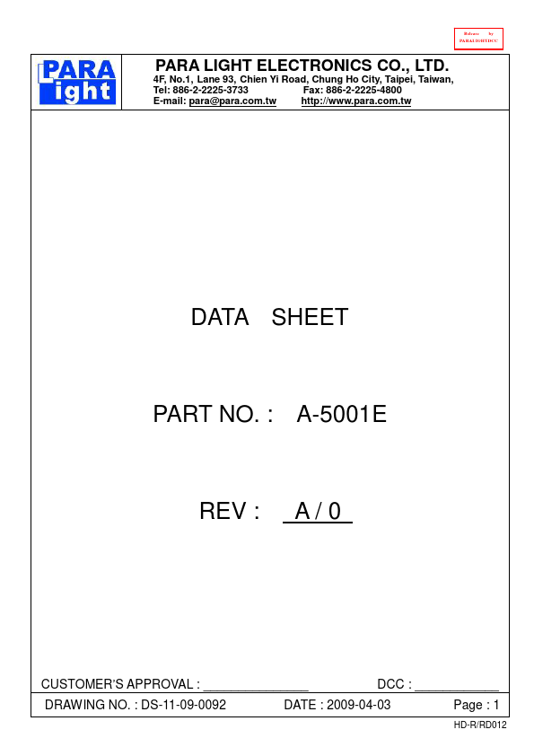 Release by PARALIGHTDCC PARA LIGHT ELECTRONICS CO., LTD. 4F, No.1, Lane 93, Chien Yi Road, Chung Ho City, Taipei, Taiwan, Tel: para@para..tw http://.para..tw DATA SHEET PART NO.