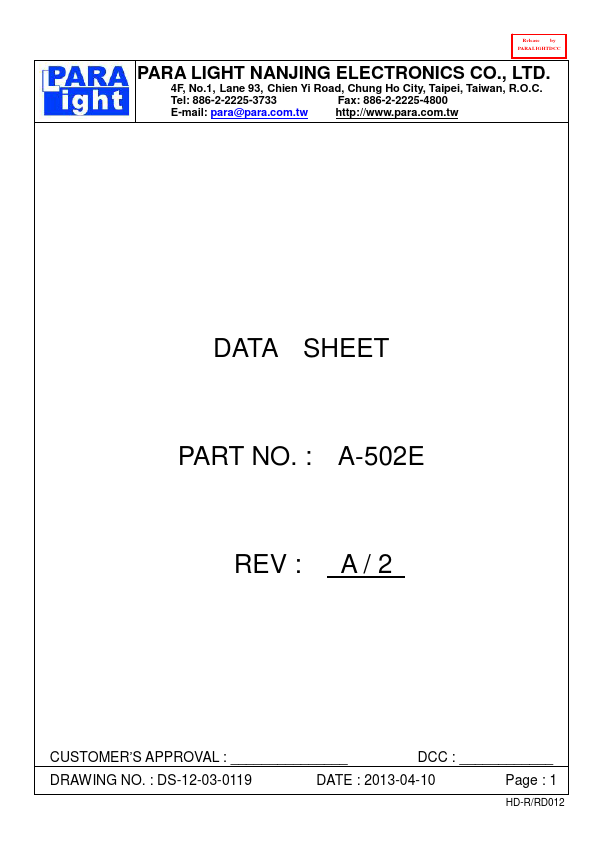 Release by PARALIGHTDCC PARA LIGHT NANJING ELECTRONICS CO., LTD. 4F, No.1, Lane 93, Chien Yi Road, Chung Ho City, Taipei, Taiwan, R.O.C. para@para..tw http://.para..tw DATA SHEET PART NO.
