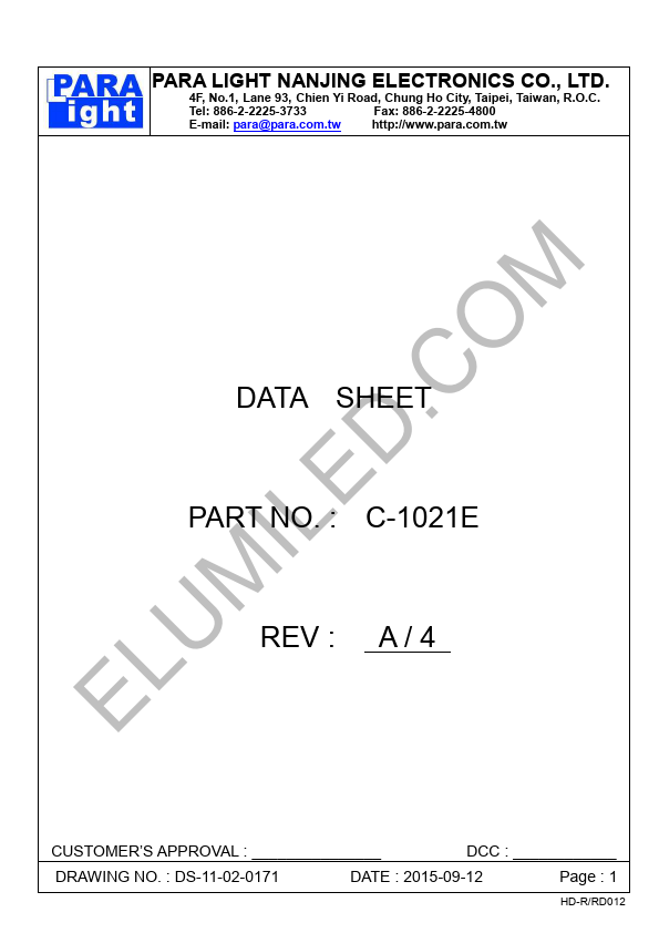 PARA LIGHT NANJING ELECTRONICS CO., LTD. 4F, No.1, Lane 93, Chien Yi Road, Chung Ho City, Taipei, Taiwan, R.O.C. 886-2-2225-4800 http://.para..tw.