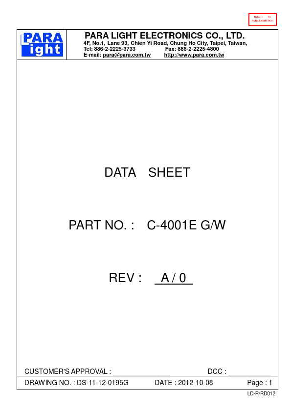 Release by PARALIGHTDCC PARA LIGHT ELECTRONICS CO., LTD. 4F, No.1, Lane 93, Chien Yi Road, Chung Ho City, Taipei, Taiwan, Tel: para@para..tw http://.para..tw DATA SHEET PART NO.