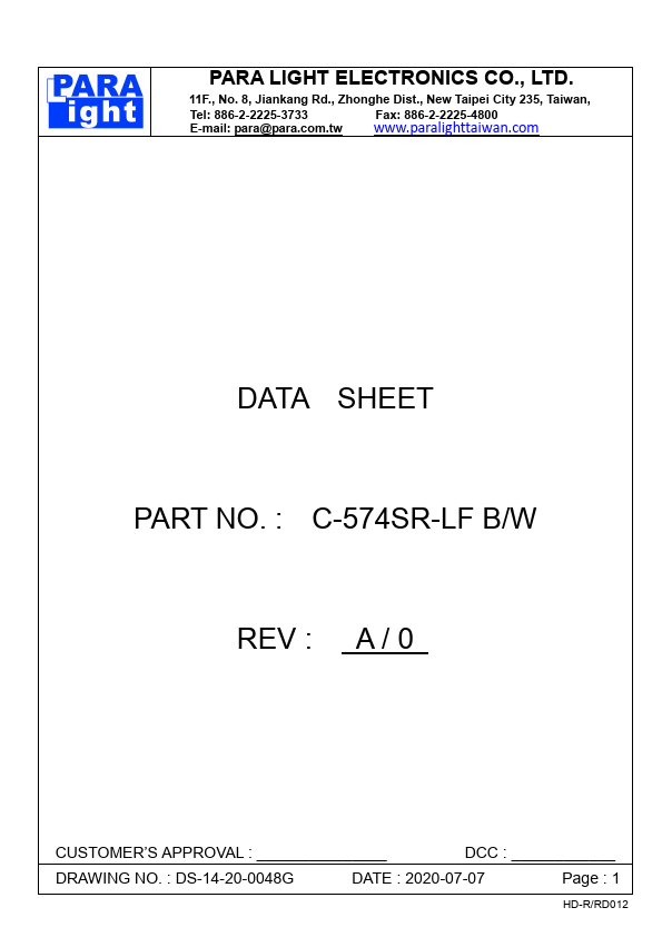 PARA LIGHT ELECTRONICS CO., LTD. 8, Jiankang Rd., Zhonghe Dist., New Taipei City 235, Taiwan, Tel: 886-2-2225-4800 .paralighttaiwan.